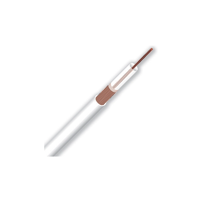 Cavo Antenna conforme alla direttiva BT 2006-95-CE. Adatto a sistemi di distribuzione destinati ai segnali di radiodiffusione sonore e di televisione analogica e digitale per l'uso di frequenze comprese tra 5Mhz e 3000Mhz. Conduttore interno composto da anima in rame. Guaina esterna in PVC. Colore bianco. Modello = lunghezza mt
