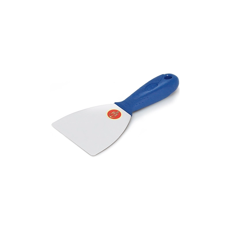 Spatola in acciaio inox con il manico in plastica per rasatura e lucidatura di stucco Veneziano e grassello di calce. Angoli arrotondati, filo lama rettificato e lippato, lama lucidata a specchio. Modello = larghezza mm