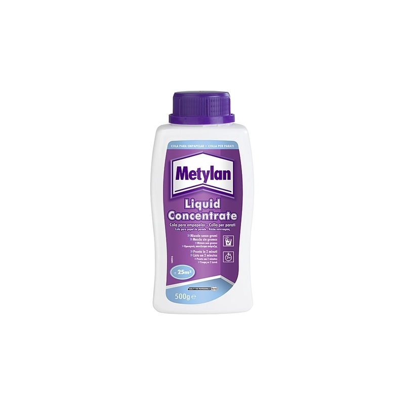 Adesivo liquido a base di metilcellulosa concentrata e resine sintetiche per l'incollaggio di parati con retro in carta, in tessuto non tessuto o in fibra di vetro. Veloce da preparare, pronto all'uso in 2-3 minuti. Alta resistenza all'umidita', facile da miscelare, forma una soluzione senza grumi. Contenuto 500 gr.