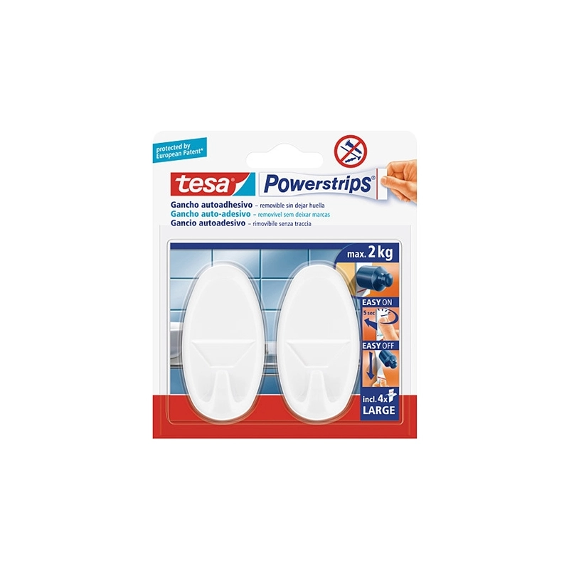 Confezione da 2 ganci in plastica di elevata qualita' piu' 4 striscie biadesive. Portata 2 kg. Removibili senza traccia.