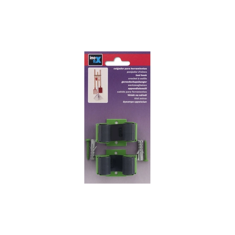 Porta attrezzi in gomma antiscivolo e morsetto in acciaio temprato. Adatto per attrezzi diametro da 25 a 38 mm. Fissaggio con vite (inclusa). In blister da 2 pz.
