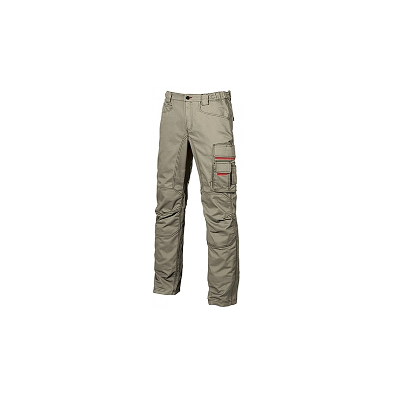 Pantalone multitasche in cotone 60% e poliestere 40%, 245 g/m2, cavallo rinforzato. Triple cuciture. Vita regolabile. Ampie tasche anteriori, laterali e porta metro regolabile. Color sabbia. Modello = taglia