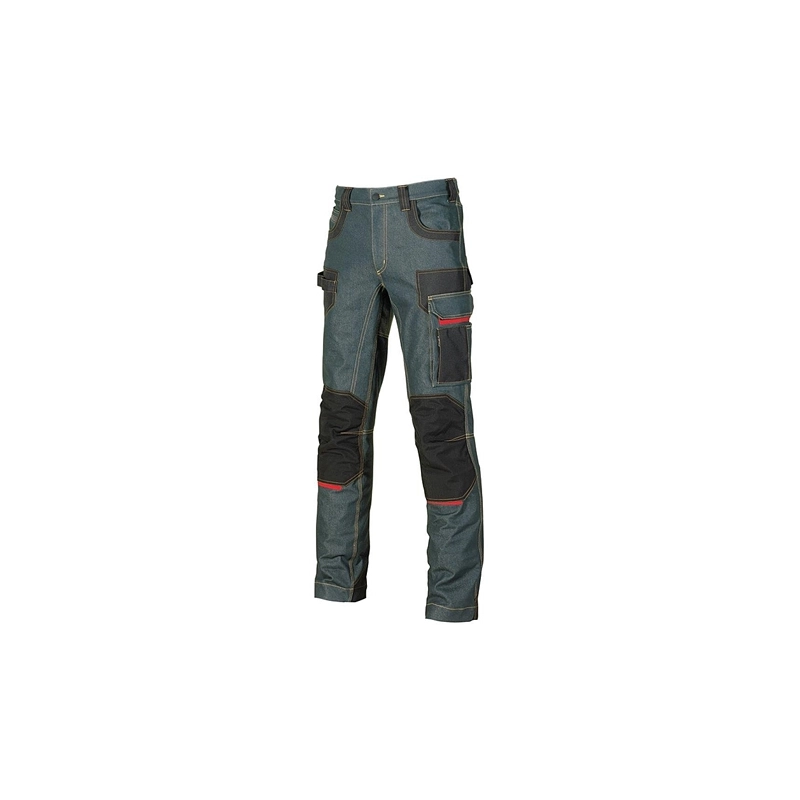 Pantalone multitasche in tessuto jeans stretch elastico con inserti in cordura. Peso 330 gr/m2. Triple cuciture. Ampie tasche anteriori e porta martello. Tasche porta ginocchiere in cordura. Modello = taglia