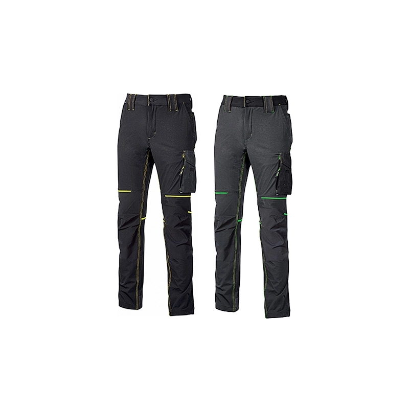 Pantalone in tessuto U-4 molto comodo, resistente, morbido sulla pelle, idrorepellente, traspirante e asciuga rapidamente. Dotato di 2 ampie tasche anteriori, elastico in vita. Triple cuciture, bottone antigraffio, zip YKK, Slim Fit. Tasca laterale, con porta badge a scomparsa, due tasche posteriori. Composizione 86% nylon e 14% spandex. 140 gr/mq. Modello = taglia/colore