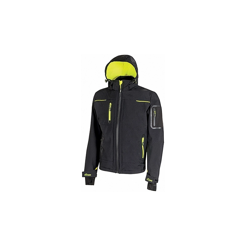 Giacca in Softshell con membrana U-Tex che rende il tessuto impermeabile, traspirante e antivento. Chiusura centrale con zip. Inserti in reflex per garantire la massima visibilita'. 2 Tasche frontali chiuse con zip fluo e coulisse antimpigliamento regolabile all'interno. 1 Tasca porta cellulare con zip fluo. 2 Tasche interne. 1 Tasca su manica sinistra. Colore black carbon. Modello = taglia