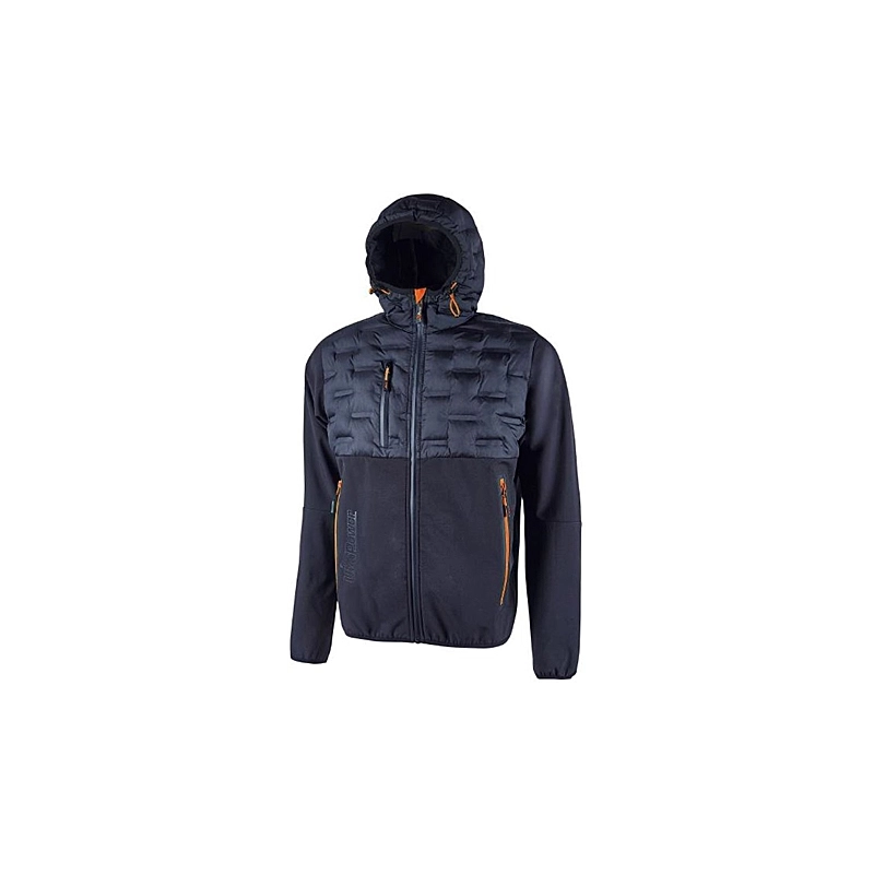 Giacca ibrida idrorepellente traspirante e antivento. Ideale per chi svolge lavori dinamici in ambienti freddi senza pero' rinunciare alla liberta' di movimento. Cappuccio fisso e regolabile, polisini elasticizzati. Busto e maniche 96% poliestere, 4% spandex. Membrana in TPU. Petto, spalle e cappuccio 100% nylon 20D. 320 gr/m2. Colore deep blue. Modello = taglia