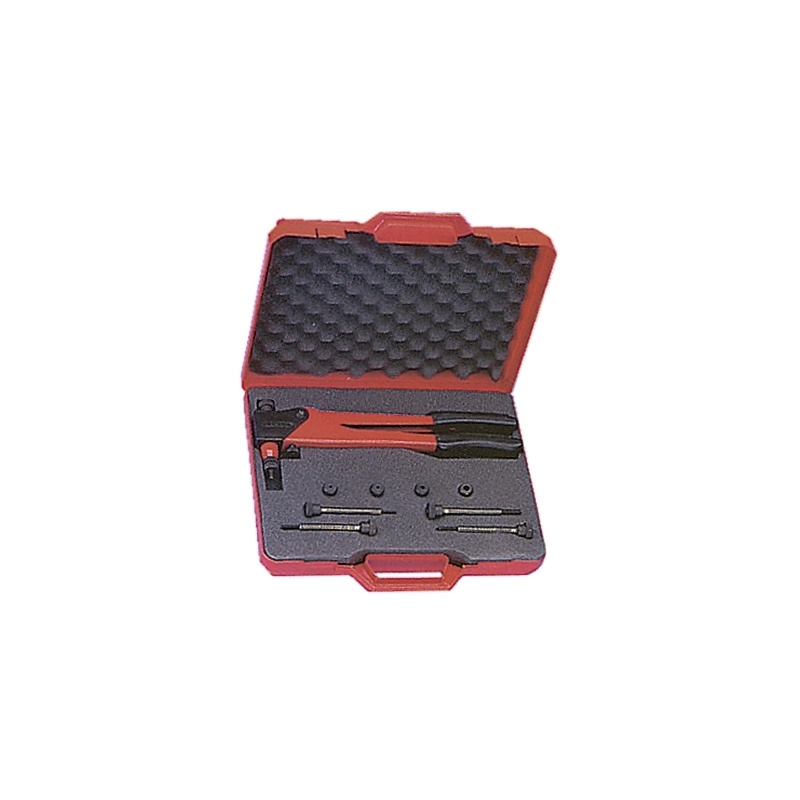 Valigetta in plastica contenente una insertatrice KJ21 con tiranti e testine da M3 a M8.