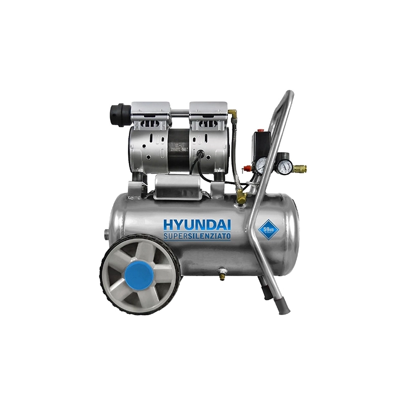 Compressore OIL-LESS silenziato 59 dB. 230V. 1,0 HP. Aria aspirata 160 lt/min. Pressione max 8 bar. 1440 rpm giri/min. Con maniglia doppia per facilitare il trasporto e ruote maggiorate. Dimensioni 49x24x53 cm. Capacita' serbatoio 24 lt. Peso 18,3 kg.