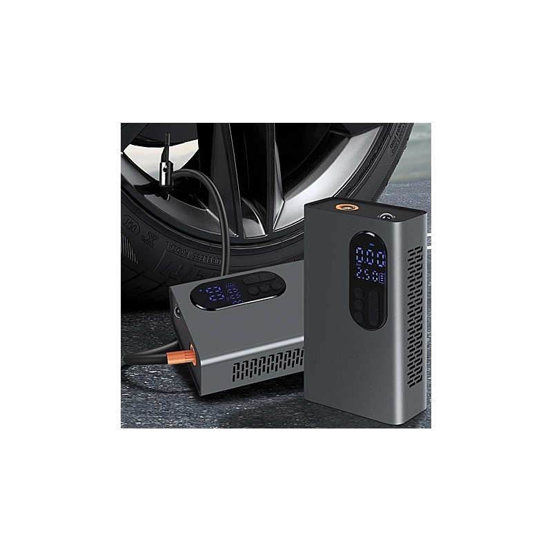 Mini compressore d'aria portatile. Pressione da 0,2 a 10 bar. Adatto per auto, motociclette, biciclette, palloni, ecc.. Sistema anti surriscaldamento. Funzione powerbank e torcia. Ricaricabile. 80 Watt. Con 2 cavi uno da 300 cm e 1 da 50 cm (USB).