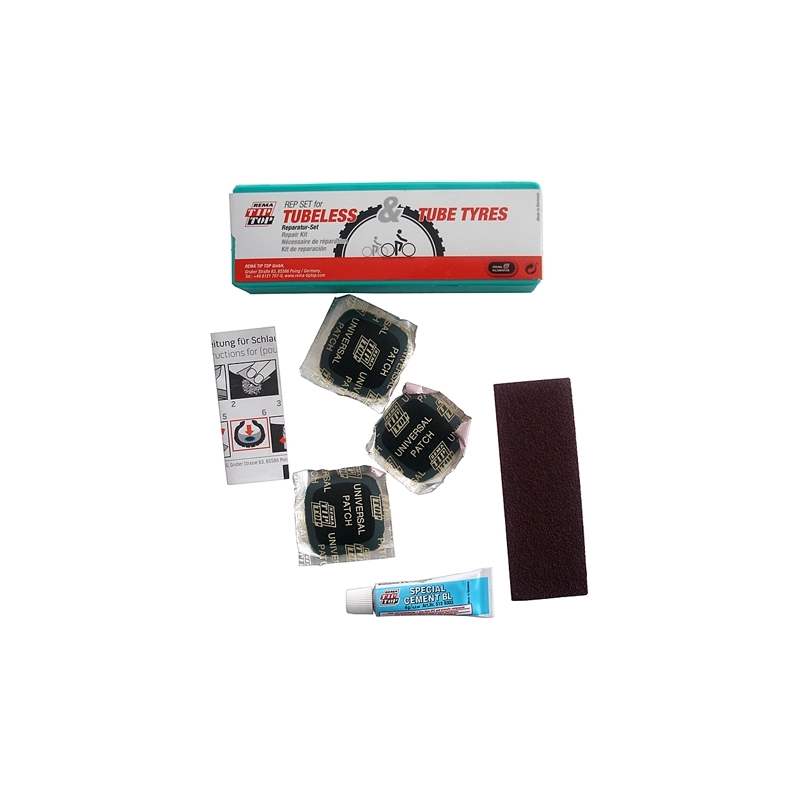 Specifico per ruote tubeless. Contenuto: 3 pezze, 1 tubetto mastice cement, 1 carta vetrata.