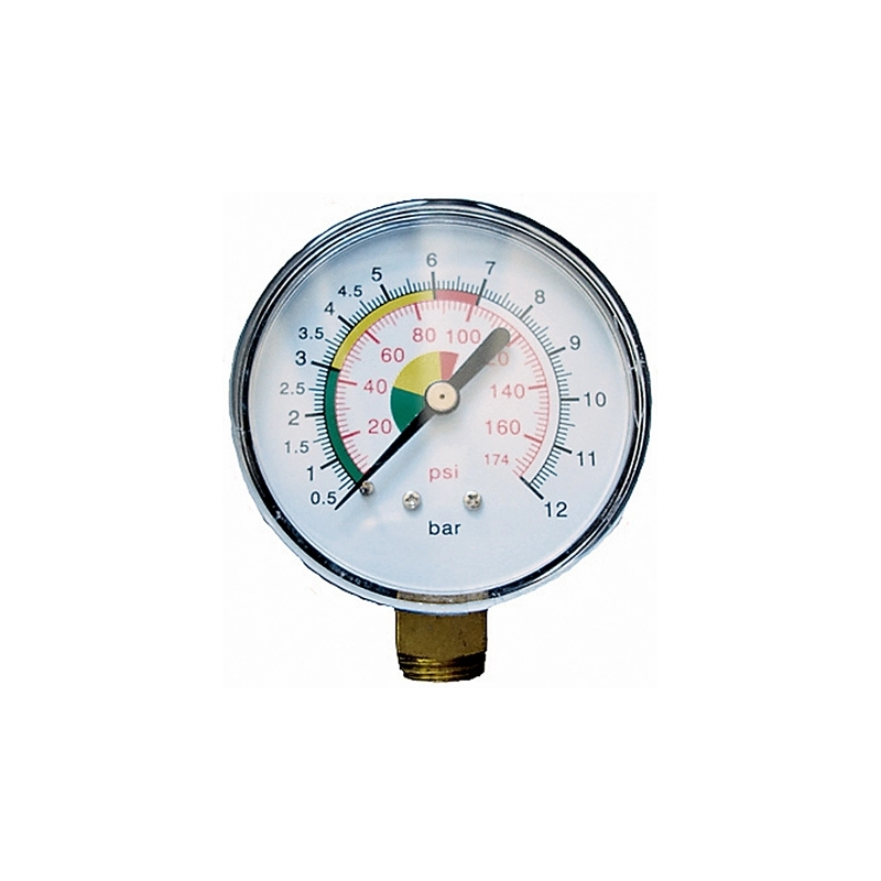 Manometro ricambio per pistole di gonfiaggio modelli 25/D, 25/D-RB e 25/E. Diametro 63 mm. Tarato da 0 a 12 bar.
