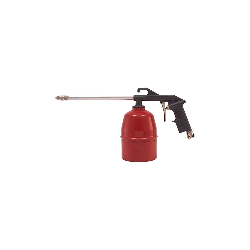 Pistola di lavaggio in alluminio con serbatoio in acciaio da 1 kg. Trattamento sabbiato verniciato. Consumo d'aria 200/250 lt/min. 6/8 bar. Disponibile beccuccio ricambio da ordinare a parte.