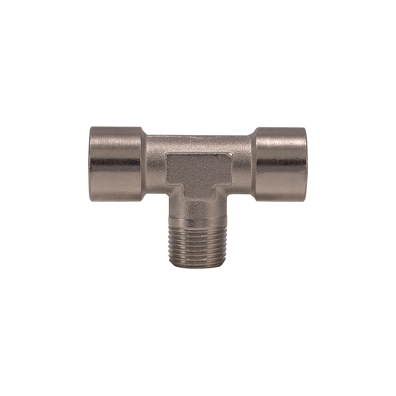 Raccordo a T in ottone nichelato. 2 femmine e 1 maschio conico. Modello = misura pollici filetto