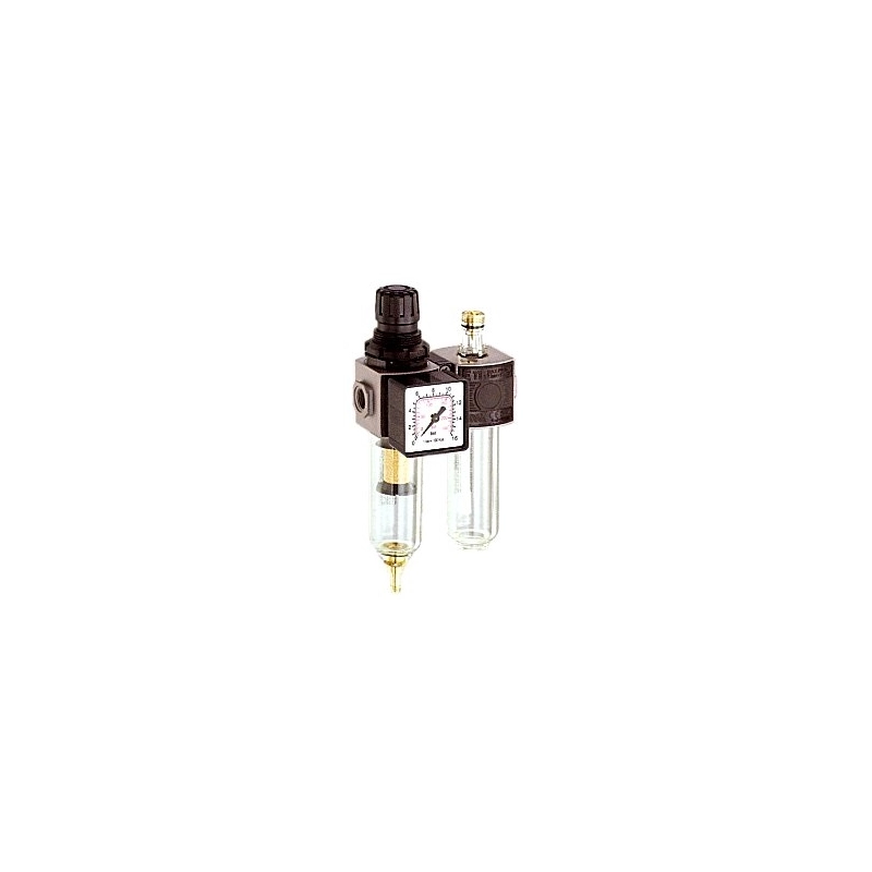 Regolatore con cartuccia filtrante in PE che trattiene impurita' fino a 50 micron, filtro con deflettore e convogliatore per una efficace separazione della condensa. Valvola di scarico incorporata, portata l/min 1400. Filettatura entrata/uscita 1/4". Modello = art./tipo