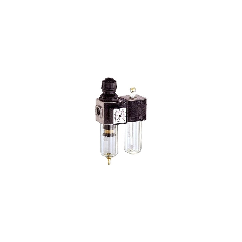 Regolatore con cartuccia filtrante in PE che trattiene impurita' fino a 50 micron, filtro con deflettore e convogliatore per una efficace separazione della condensa. Valvola di scarico incorporata, portata l/min 2800. Filettatura entrata/uscita 3/8". Modello = art./tipo