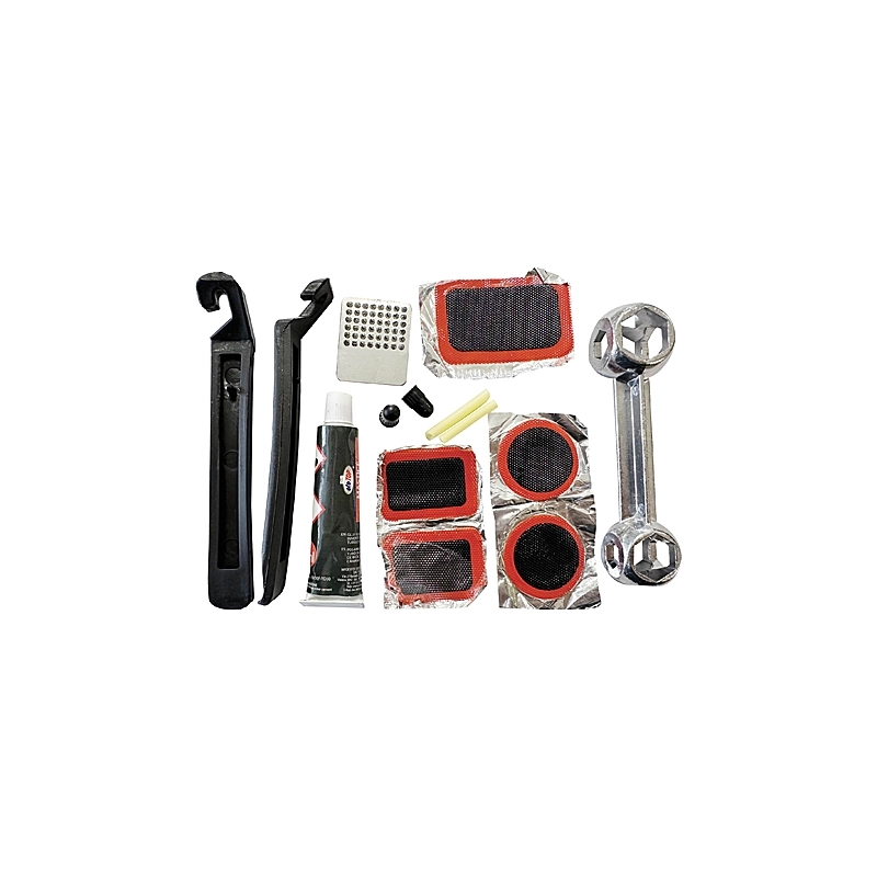 Kit composto da: 1 chiave a 10 vie, 2 levagomme in plastica, 1 tubetto di colla mastice senza benzene conforme alle normative europee EC2001/58/EC, 1 grattugia/spatolina, 2 pezze diametro 2,5 cm, 2 pezze 3x2 cm e 1 pezza 4,5x3 cm.