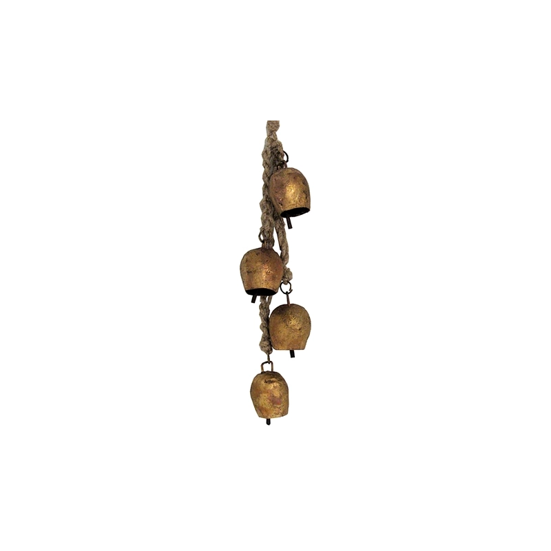 Grappolo di campane in metallo e ghisa da appendere. Legate con corda. Colore oro antico. Modello = numero campane/lunghezza totale cm