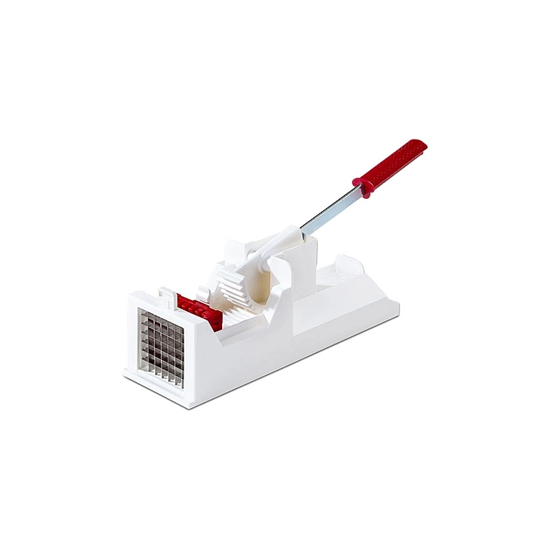 In polistirene antiurto atossico. Lame in acciaio inox in due misure. Trancia patate lunghe sino a cm 9