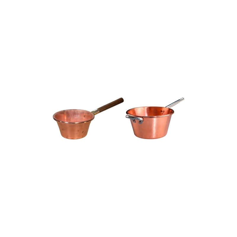 Paioli in rame con fondo piano e manico in legno oppure in metallo. Modello = diametro cm/Capacita' l/tipo di manico/con o senza maniglia