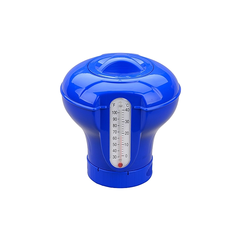 Distributore galleggiante per pastiglie di cloro da 200 gr. Con termometro per la rilevazione della temperatura dell'acqua.