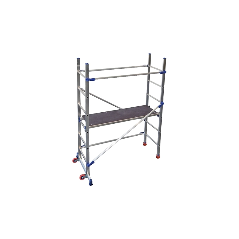 Trabattello in alluminio munito di ruote su un lato e di piedini con stabilizzatore antiribaltamento sull'altro. Montanti da mm 24x50. Gradini da mm 24x24. Montaggio rapido. Dimensioni cm (lxpxh): 146x90x189. Portata 150 kg.