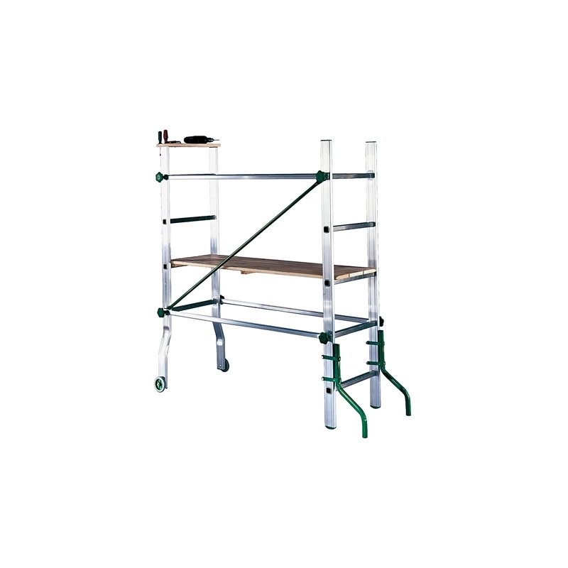 Trabattello in alluminio munito di ruote su un lato e di piedini con stabilizzatore antiribaltamento sull'altro. Montanti da mm.25x65. Gradini da mm.30x30. Dimensioni cm.(lxpxh): 142x65x162. Portata max kg.120