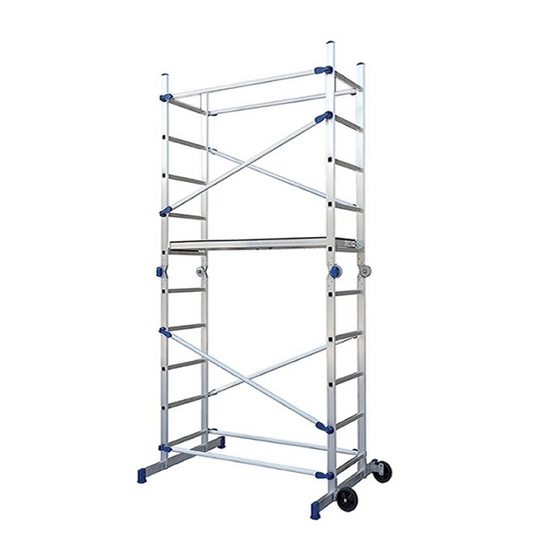 Trabattello in alluminio con sistema di snodi brevettati che permettono di ripiegare i fianchi verso l'esterno senza dover smontare la parte bassa del trabatello. Completo di 2 stabilizzatori e ruote su un lato. Dimensioni cm (lxpxh):153x51x310. Pianetto in alluminio e legno da cm 153x51. Altezza max.pianetto cm 178