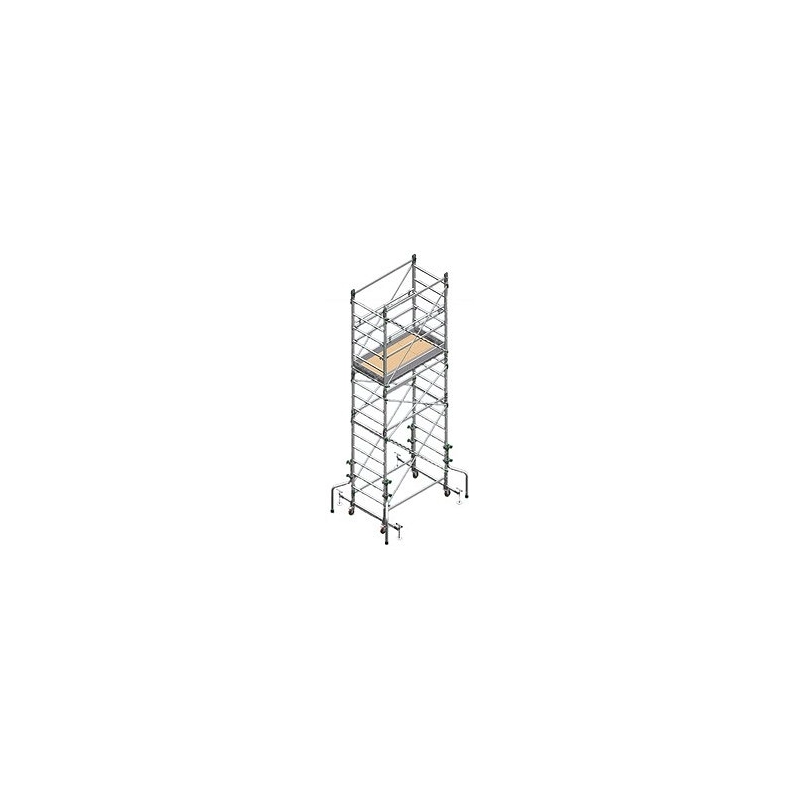 Elementi per la costruzione del trabatello professionale in alluminio a norma EN 1004 fino all'altezza max di m 9,50. Sezione delle spalle portanti mm 25x65. Dimensioni base cm 169x94. Piano di lavoro comprensivo di fascia perimetrale. Per le possibili composizioni vedi pagina a fianco. Livellatori a vite da ordinare a parte.