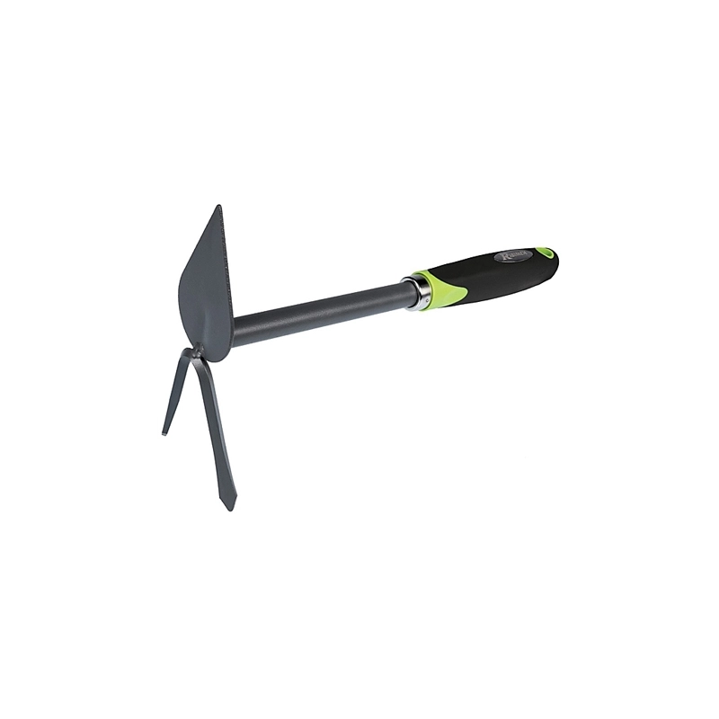 Con lama a cuore, bidente e manico in plastica bicomponente.
