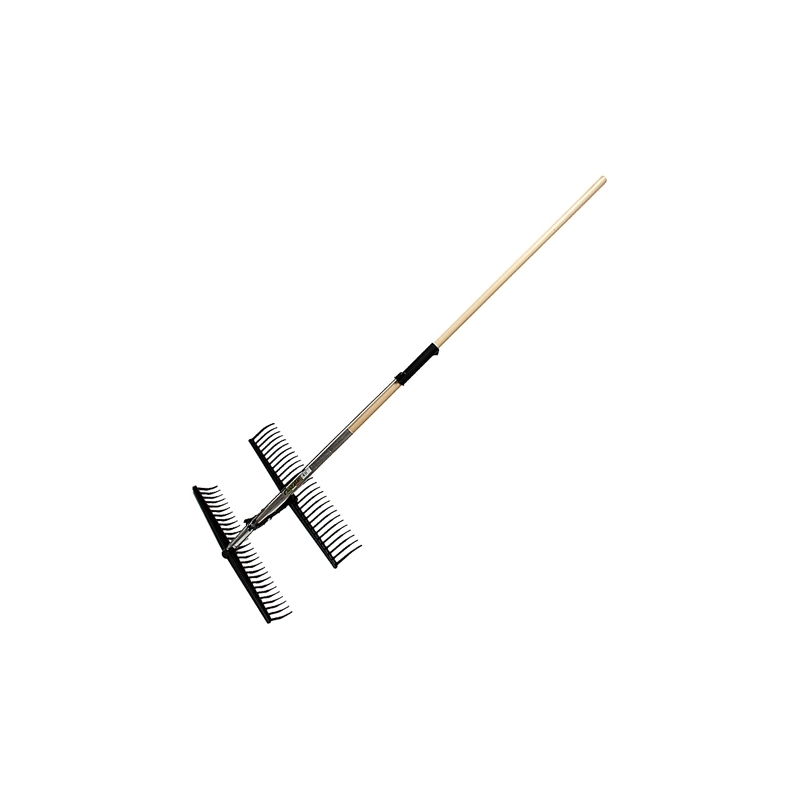 Rastrello raccoglitore con leva di azionamento sul manico. Manico in legno di tiglio, corpo in alluminio, staffa movimento e rastrelli in polipropilene. Larghezza cm 55, lunghezza totale cm 170. Peso kg 1,2 circa. Da montare.