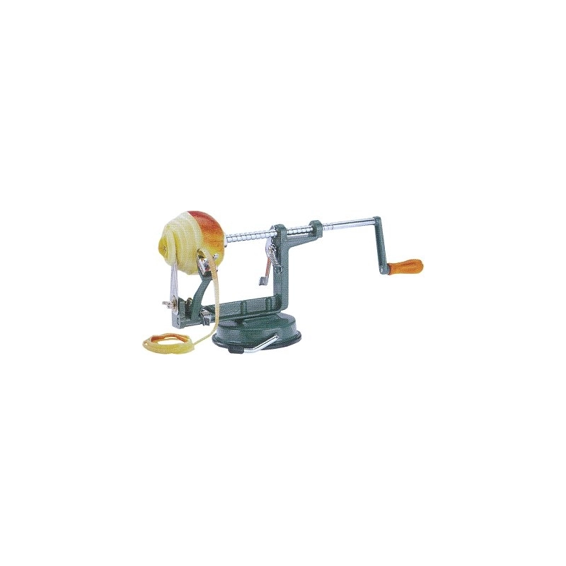 Pela, taglia e leva il torsolo in un'unica operazione. Materiale: alluminio e acciaio inox. Bloccaggio a ventosa.