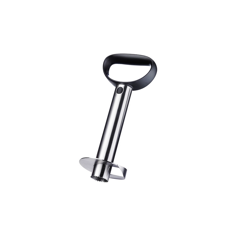 In acciaio inox. Sbuccia e affetta l'ananas in un'unica operazione e non disperde il succo. Dimensioni 245x105x85 mm.