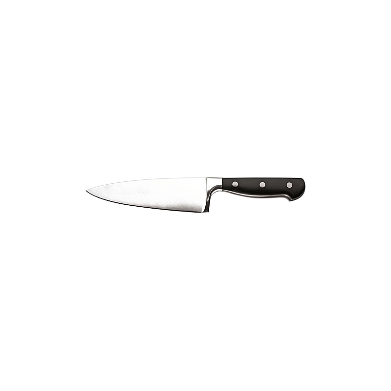 Coltello da cuoco forgiato in acciaio inox con manico in POM (poliossimetilene) lucido rivettato. Modello = lunghezza lama cm