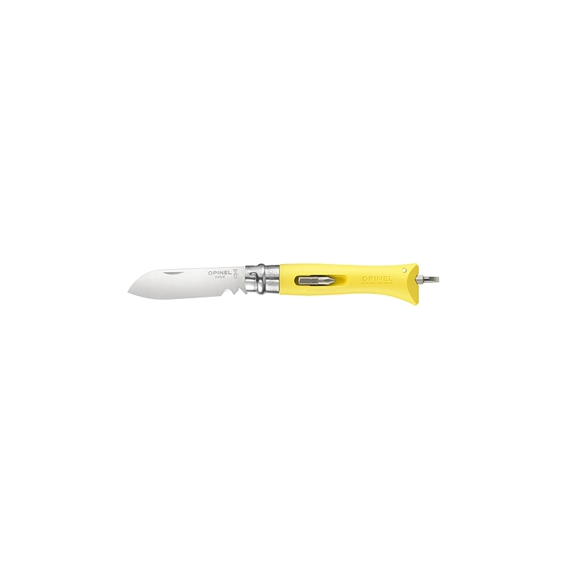 Coltello serramanico Opinel Bricolage, lama inox da 80 mm. Lama con 2 incavi affilati che permettono di sguainare e tagliare cavi da 5 a 8 mm. Inserto a taglio da 4 mm e uno a croce PH2 inseriti nel manico. Anello a doppia sicurezza virobloc. Colore giallo.