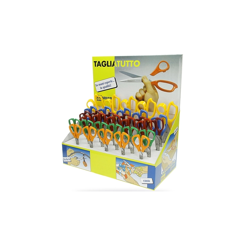 Forbici con lama in acciaio inox e manici in nylon. L'espositore comprende: numero 5 forbici 5" - numero 6 forbici 6" - numero 11 forbici 7" - numero 5 forbici 8" - numero 5 forbici 8" 1/2