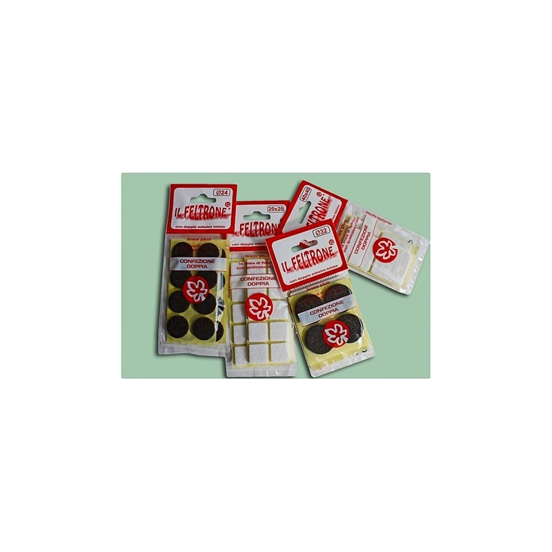 Feltrini adesivi con doppio adesivo telato. Realizzati con feltro nazionale da gr.620 mq. Colore marrone. Modello = forma/diametro o dimensioni mm/pz per confezione