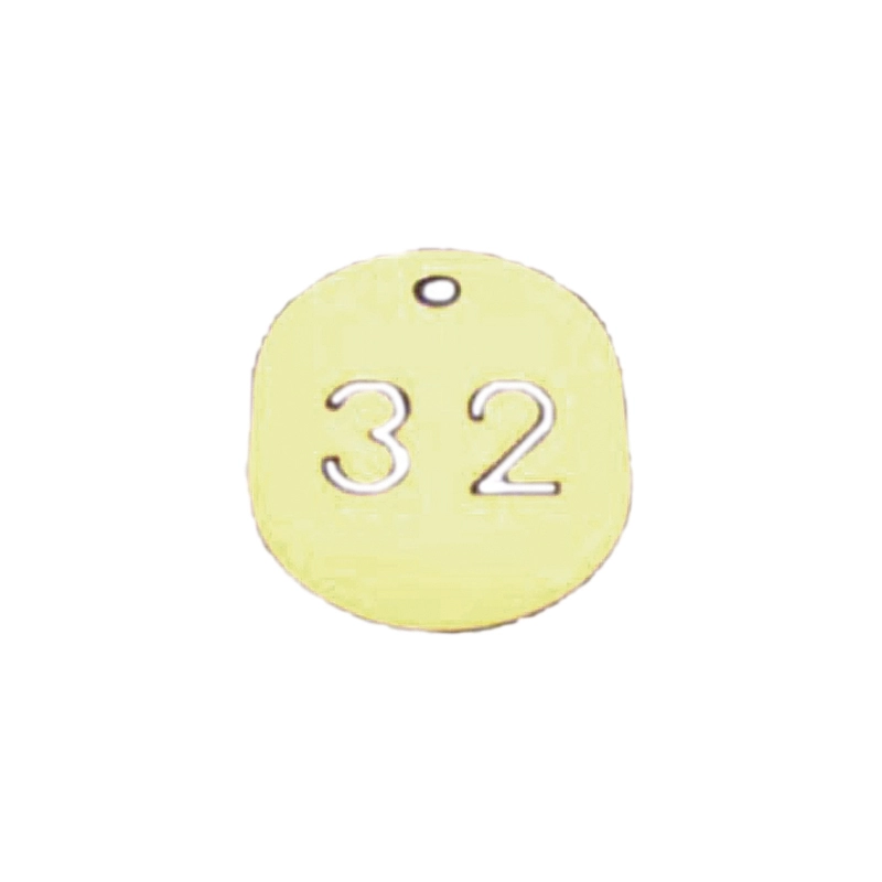 In ottone lucido zaponato, numerata da 1 a 100. Dimensioni mm 22x30x0,5. Modello = numero