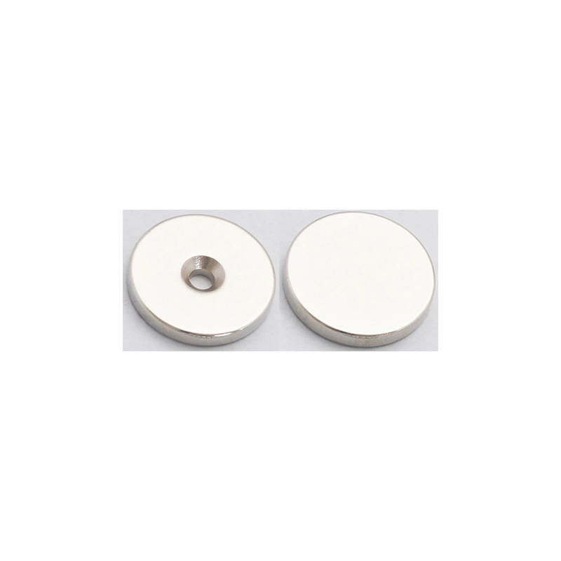 Magnete al neodimio con foro svasato o senza foro. Altezza 3 mm. Temperatura massima di esercizio 80 gradi. Modello = diametro mm/forza attrazione kg/con foro o senza