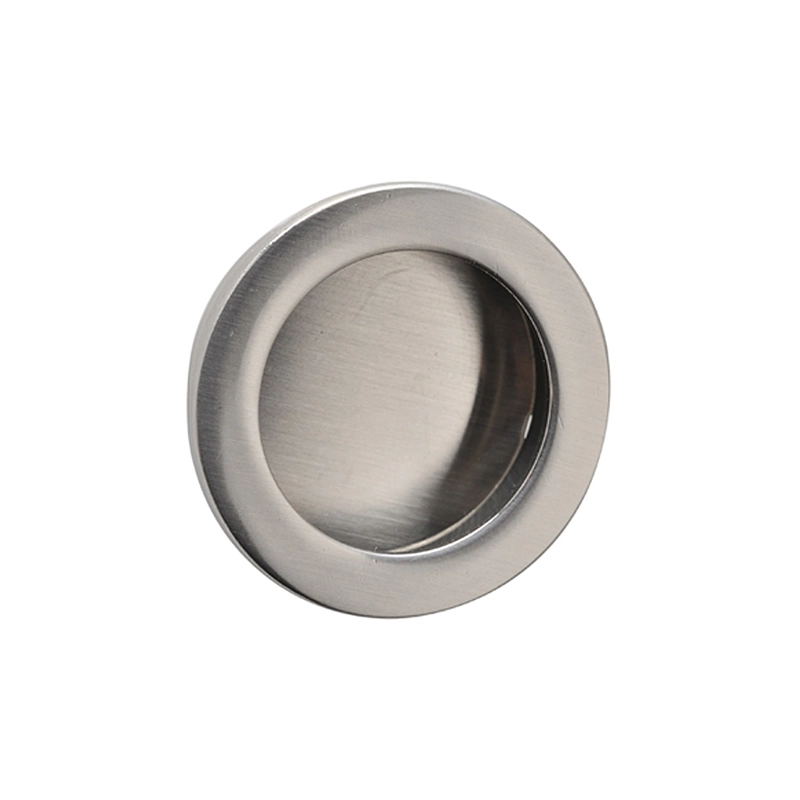 Maniglia in zama pressofusa da incasso. Diametro incasso 35 mm. Profondita' incasso 10 mm. Diametro totale 40 mm. Finitura nichel satinato.