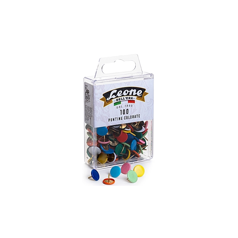 Puntine da disegno con corpo metallico ottonato e testa plastificata colorata. Colori assortiti. In scatola appendibile da 100 pz.