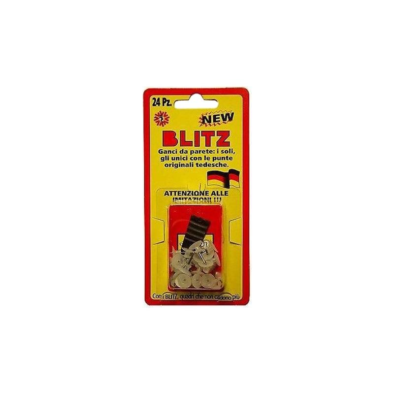 Ganci BLITZ originali in nylon con chiodi in acciaio speciale super appuntiti, Made in Germany. Da parete con 1 chiodo. Blister da 24 pezzi con applicatore.