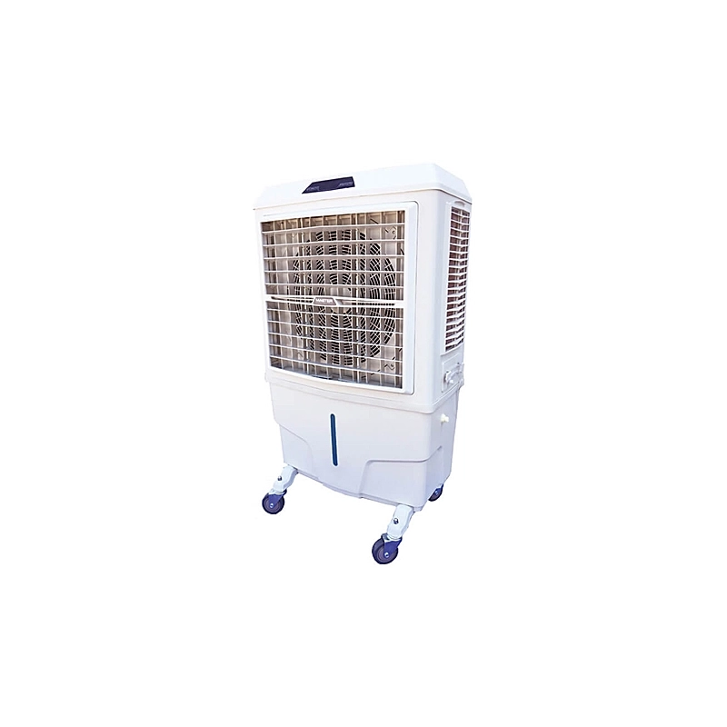 Raffrescatore evaporativo che raffresca l'aria tramite processo naturale, l'acqua di evaporazione riduce la temperatura dell'aria. Una pompa preleva l'acqua da un serbatoio e inumidisce un cuscinetto di cellulosa. Un ventilatore aspira l'aria attraverso un filtro. L'acqua evapora e diminuisce la temperatura dell'aria di diversi gradi. L'aria esce pulita e fresca. 1980 Watt. 55 dB. 790x620x1326 mm.