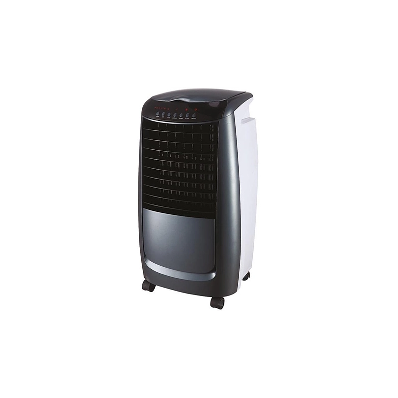 Raffrescatore d'aria multifunzione. 220 V - 50 Hz 85 W. 3 velocita' del vento. Timer 7,5 ore. Dotato di filtro polvere e telecomando. Indicatore di mancanza d'acqua. Vano superiore portaghiaccio per una maggiore efficienza. Regolazione della direzione del vento. Serbatoio dell'acqua 8 litri. Funzione ionizzatore ed evaporatore.