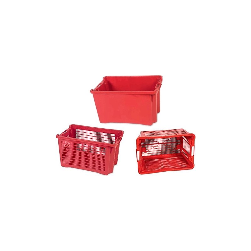 Cassetta in plastica disponibili in 3 modelli: tutta chiusa, forata con fondo chiuso e tutta forata. Infilabili una nell'altra in un verso, sovrapponibili nell'altro verso. Grande risparmio di spazio nello stoccaggio e nel trasporto. Dimensioni mm 560x350x31h. Certificate per uso alimentare. Capacita' l 40. Modello = tipo cassetta