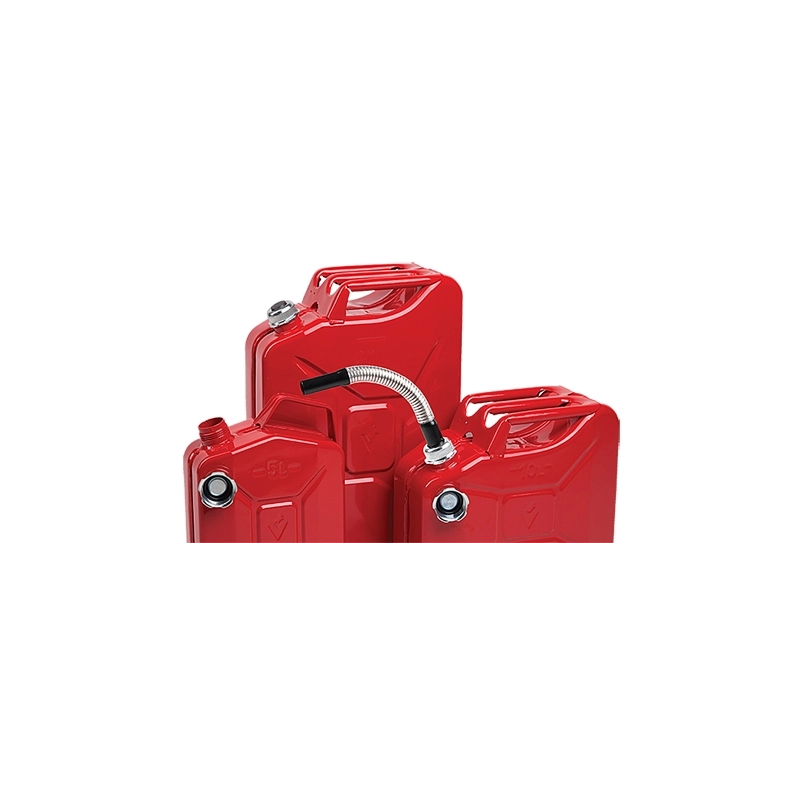 Verniciatura a polveri a doppio strato. Chiusura di sicurezza con tappo a vite, tappo magnetico per fissaggio alla tanica. Rispetta la normativa TUV + GS + UN. Disponibile da ordinare a parte il beccuccio flessibile in metallo a vite. Modello = capacita' lt