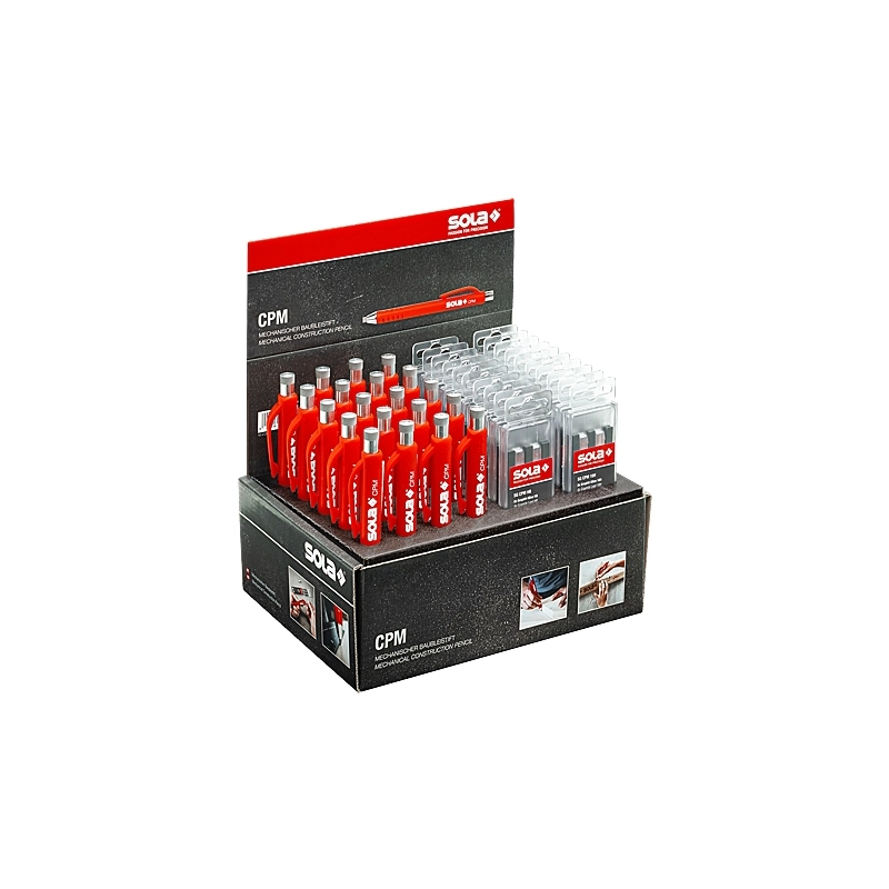 Matita per edilizia con mine a profilo rettangolare con avanzamento automatico. Mina in grafite, durezza HB. Lunghezza 15,5 cm. Marcature precise. Protezione contro polvere e umidita'. Applicazioni: calcestruzzo, laterizi, legno asciutto, carta e cartone. Espositore composto da 20 matite CPM, 10 blister da 6 mine HB e 10 blister da 6 mine 10H