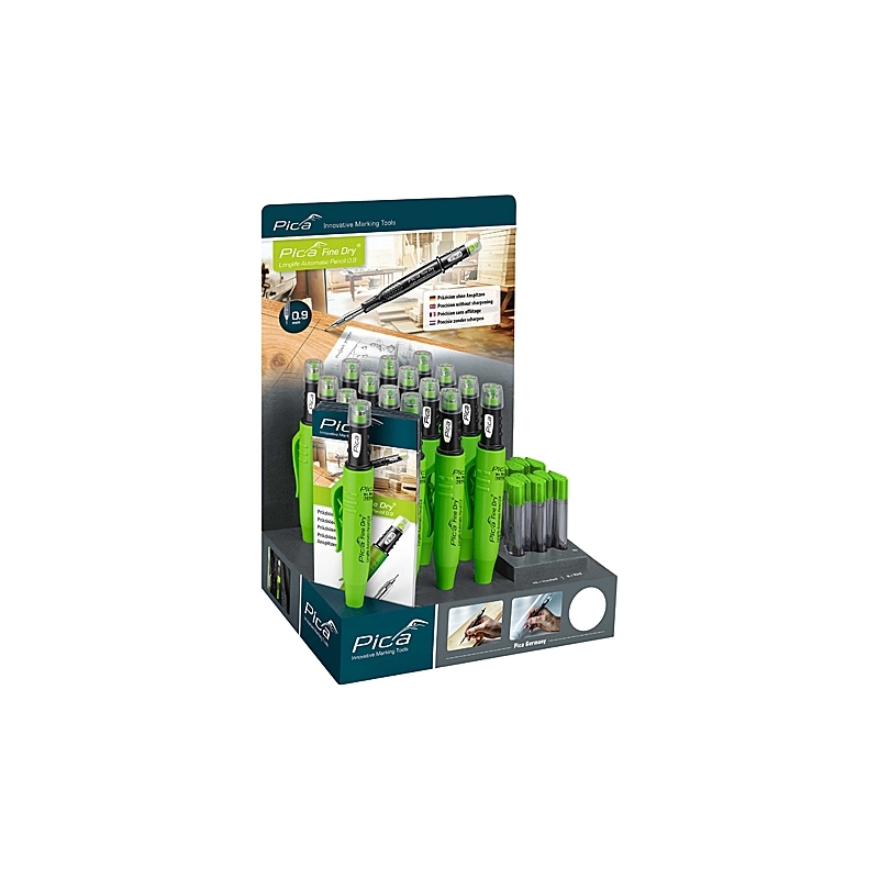 Espositore composto da 20 matite Pica fine Dry con 5 mine in grafite HB incluse e 15 confezioni da 10 mine di cui 10 HB e 5 H. Dimensioni 195x130x267 mm.