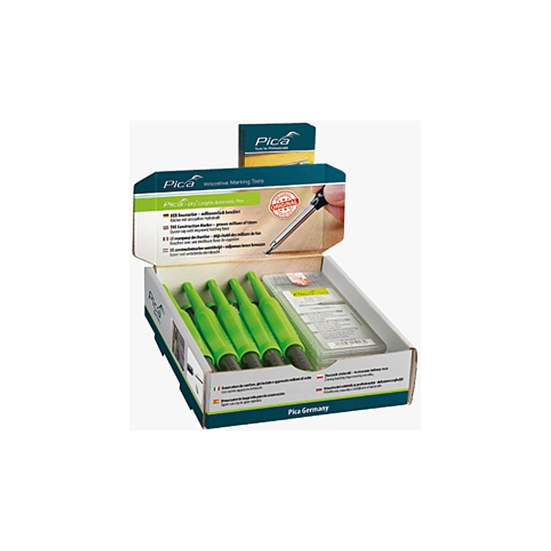 Espositore composto da 10 matite Pica Dry con mine speciali in grafite e 5 confezioni da 10 mine universali ricambio per Pica Dry.