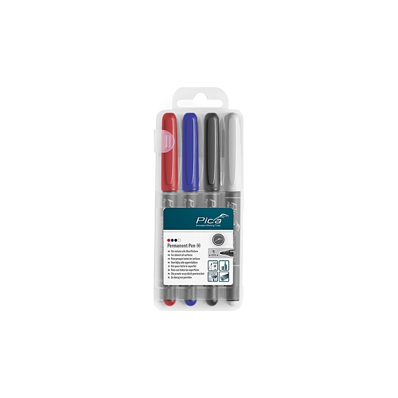 Set 4 marcatori indelebili con punta media. Colori: rosso, blu, nero, e bianco. Punta del marcatore 1 mm. Per marcature su quasi tutte le superfici.