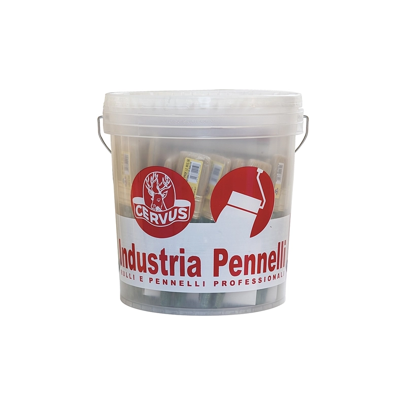 Secchio contenente 108 pennelli della serie 29 a setola bionda assortiti tra le misure: 20, 30, 40, 50 e 60 mm. Spessore 15 mm.